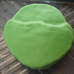 Once you have cut away the shape, it’s then simply a case of covering the cake in green icing and then placing a bandana shaped piece of icing over the top. We didn’t cut away from the eyes, but instead add a thin layer of white on top of the red bandana. We also did the same for the mouth, before surrounding the features in black icing to make them stand out.