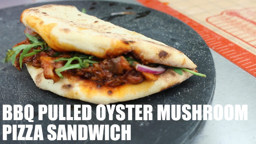Our latest creation is a little different. It’s a BBQ Pulled Oyster Mushroom Pizza Sandwich.